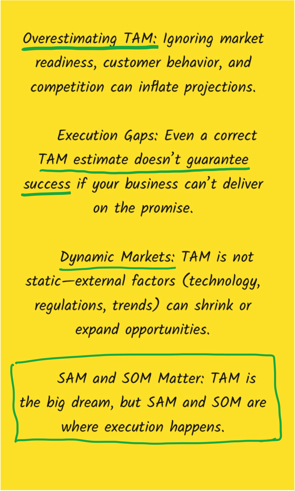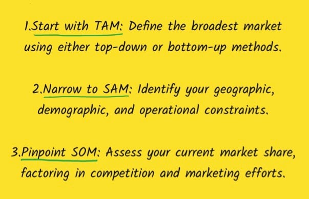 TAM is your dream, SAM is your plan, and SOM is your starting point. The magic happens when you can adapt these numbers as the market evolves.