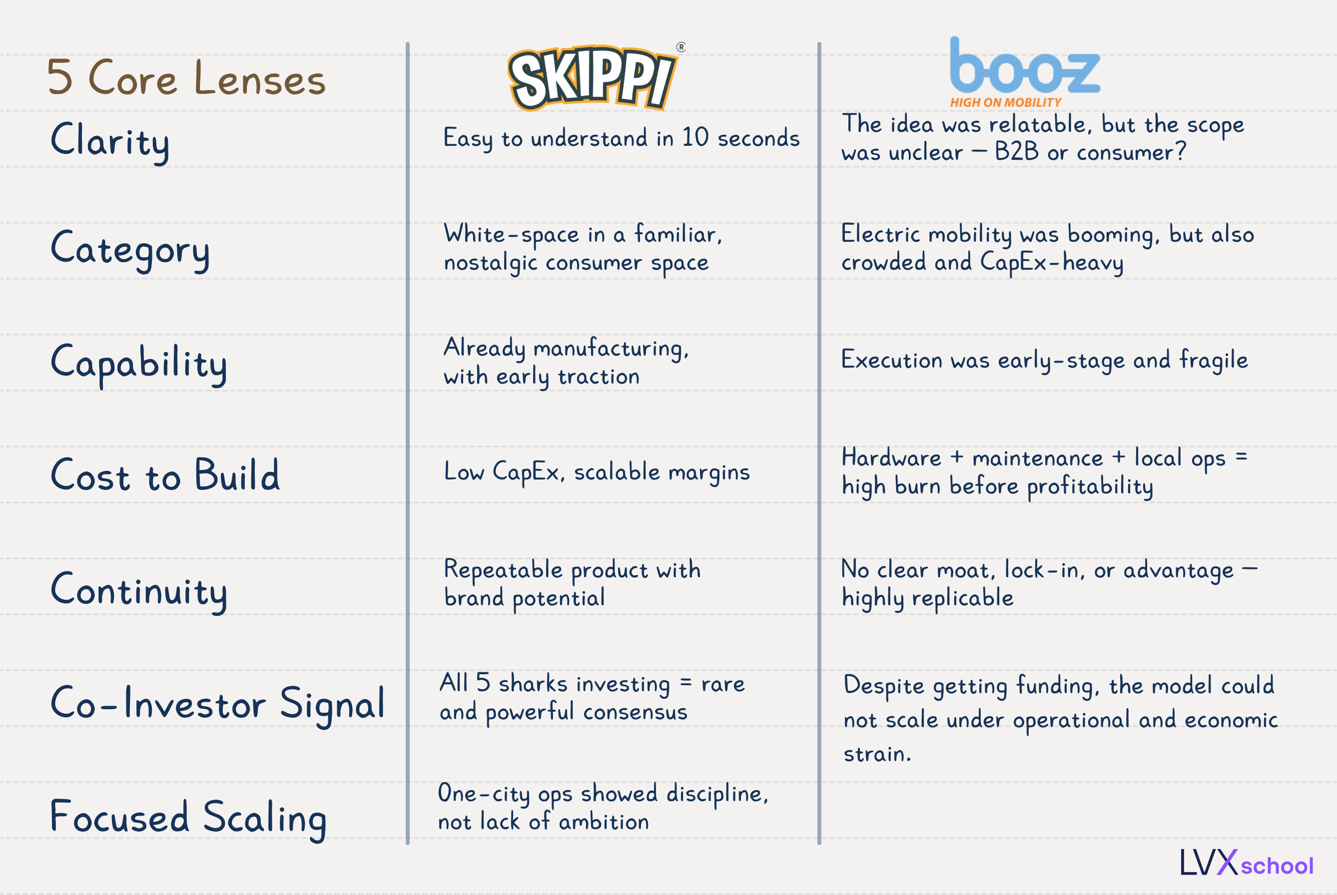 It is easy to get excited about charisma, storytelling, or traction slides. But the real work lies in building a consistent lens — one that helps you cut through the narrative and evaluate the business. In this post, we will introduce a simple, practical investor framework — and apply it to two contrasting startups from Shark Tank India Season 1